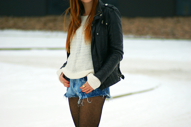 EN: Without unnecessary accessories. I always loved the combination of my white sweater and jeans shorts - this one I made by myself. Black tights, leather jacket (tradicionally) studded and snapback.