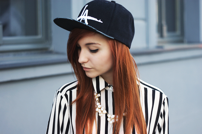 snapback LA URBAN FLAVOURS / striped shirt koszula w paski ROMWE / leggins legginsy OASAP / point heels szpilki z ostrym czubkiem CZASNABUTY / t-shirt bluzka & bag torba NOWISTYLE / rings pierścionki STICKY & SWEET
