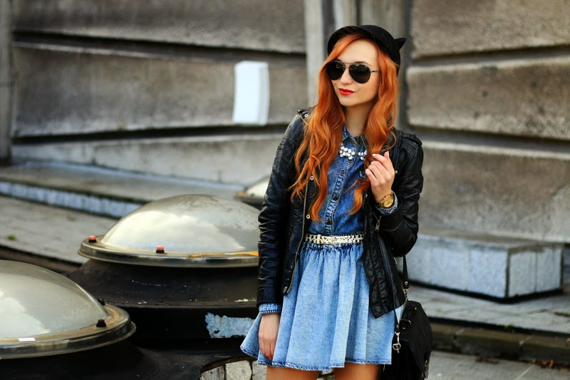 Czasem warto postawić na odważniejsze połączenia. To z pozoru może wydawać się wcale nie takie odważne, choć dla mnie jest. Być może to nie tylko przez dobór ubrań, ale też przez czerwoną szminkę po którą sięgam bardzo rzadko. Lubię łączyć masywne buty ze spódnicami mini czy mocno przylegającymi legginsami, po prostu podoba mi się efekt choć niektórzy mogą stwierdzić, że to do siebie nie pasuje bo gubią się proporcje. Tutaj połączyłam czarną skórę na botkach, torebce i kurtce z bardziej dziewczęcym delikatnym jeansem, oba materiały to klasyka. Przełamałam całość czapką z kocimi uszami i właśnie czerwoną szminką; nadają mocnego charakteru.